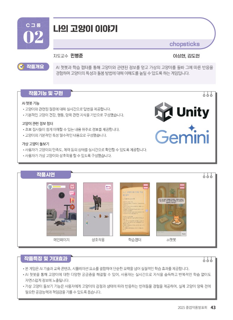 - 사용자가 고양이 육아에 필요한 정보들을 AI와 학습챕터를 통해 얻을 수 있는 학습용 게임임