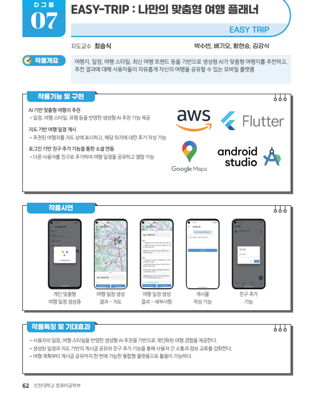 EASY-TRIP은 사용자가 입력한 여행지, 기간, 동행자 유형, 선호 스타일 등을 기반으로 AI가 여행 일정을 추천하고, 지도 API를 통해 시각화, 친구와 일정을 공유하고 피드백을 나눌 수 있는 모바일 앱이다. Flutter, AWS, Google Maps API, Node.js 등을 활용하여 개발하였다.