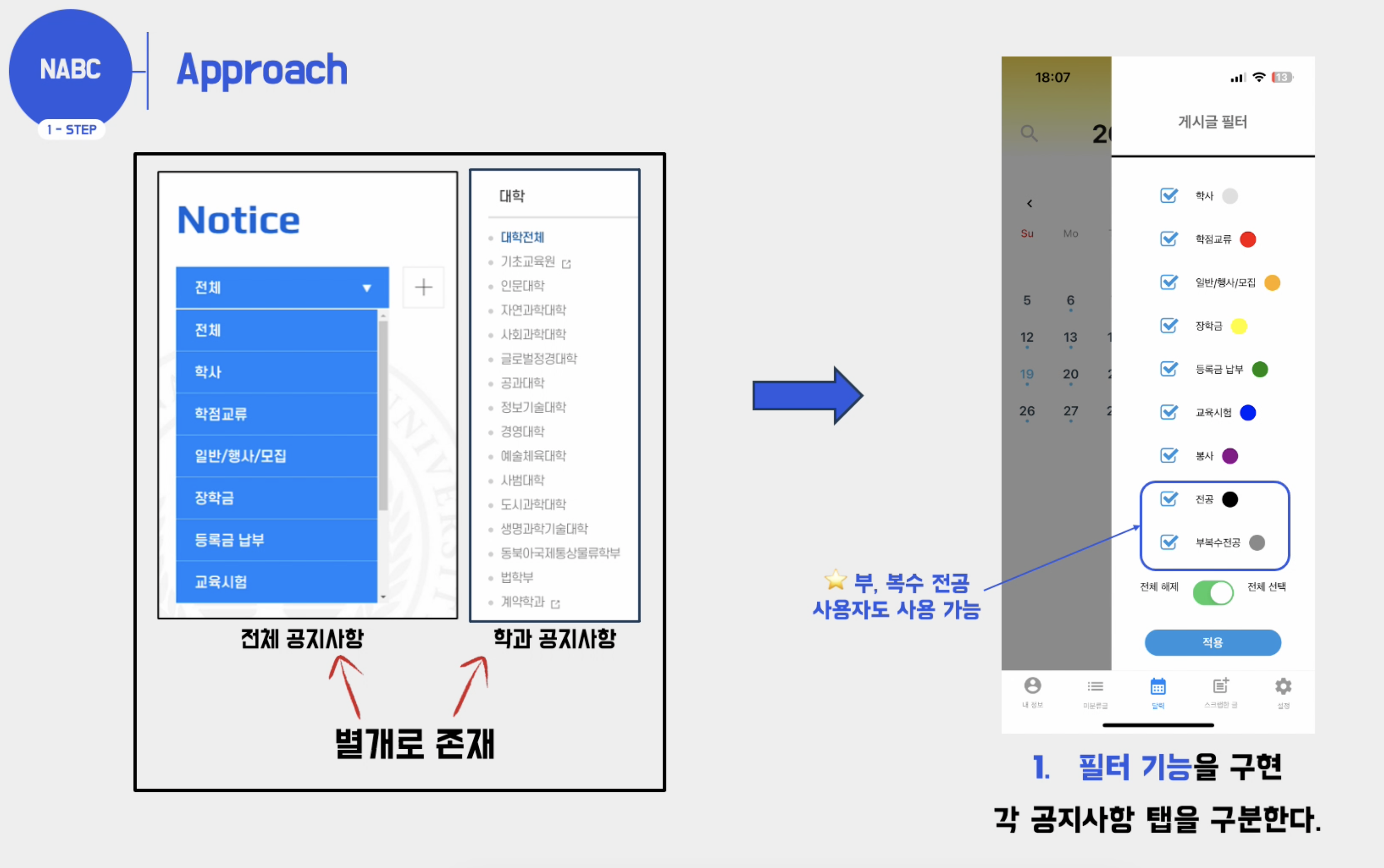 - 전체 공지사항과 학과 공지사항을 하나의 필터에서 구분하였습니다.