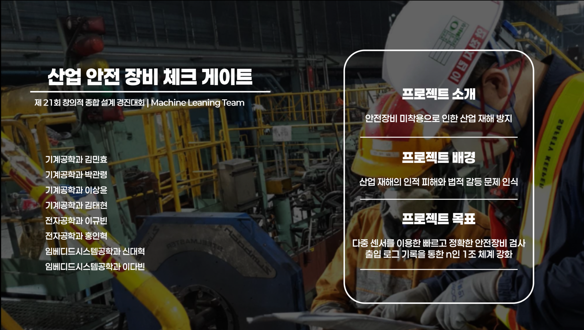 산업 현장에서 안전 사고는 끊이지 않고 발생하고 있다. 이러한 산업재해는 인명피해를 발생시키며 "안전장비를 상급자의 명령에 따라 착용하지 않았다. VS 해당 직원은 정규직이 아니기 때문에 개인의 잘못이다" 와 같이 장비 착용 여부에 대한 증거가 없어 법적 분쟁을 불러오기도 하며 기업 이미지에 손상을 주어 주가 변동이나 매출량에 문제를 주기도 한다. 또한 경우에 따라 사업장이 영업 정지를 받거나 부가세를 내는 등 여러 문제를 가져온다. 이처럼 산업재해는 조속히 해결되어야만 하는 문제중 하나이다. 따라서 [머신리닝]팀은 산업재해 발생률을 줄이기 위해 안전장비 착용 검사를 강화하고, 다인 1조 체계를 강화함으로써 산업 현장의 안전과 근로자의 노동 환경 개선을 위한 작품을 고안하게 되었다.