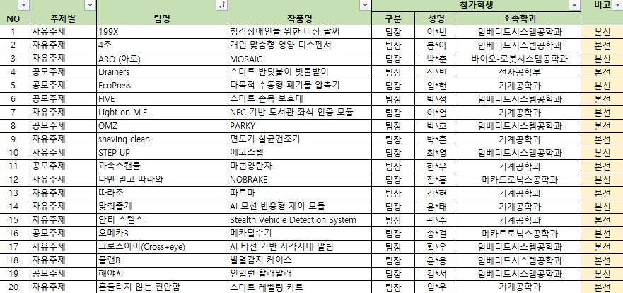 <제10회 INU Maker경진대회> 1차 서류심사를 통해 본선진출이 결정된 20팀입니다. 본선진출팀은 '아이디어붐 첫화면- 작품등록'에 출품작을 12월 5일(금) 18시까지 업로드바랍니다.(기한엄수)