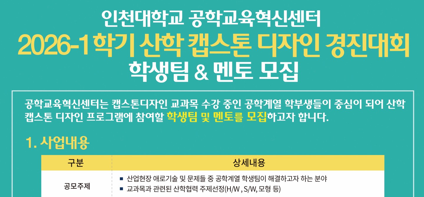 - 신청양식 다운로드 : 아이디어붐(www.ideaboom.net) -> 경진대회 -> 2026-1학기 산학 캡스톤 디자인 경진대회 -> 공지사항
