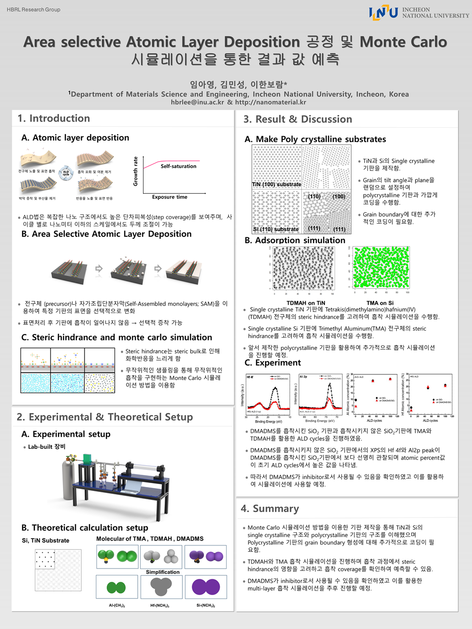 효율적인 공정 설계를 위해 실험적 접근 뿐만 아니라, 이론적 계산, 실험 결과의 분석이 필요하다. 따라서 무작위적인 샘플링을 통해 무작위적인 흡착을 구현하는 Monte Carlo 함수를 이용한 시뮬레이션을 DFT 결과 값 관련 논문과 접목시켜 흡착 과정에서 일어나는 steric hindrance를 분석하고 이러한 방법으로 구한 이론적 계산 값을 실험에서 얻어진 값과 비교 분석하고 다층 박막 증착에 대한 실험 또한 시뮬레이션으로 구현했다.